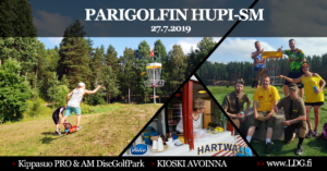 Tapahtumakooste luettavissa tästä linkistä. LISENSSIVAPAA PARIGOLF-TAPAHTUMA Maistuisiko pari kiessiä leppoisaa frisbee-parigolffia? Haluatko rentoon tapahtumaan, jossa asiallinen käyttäytyminen ratkaisee? Tervetuloa 27.7. Heinolan Kippasuolle, jossa pelataan Parigolfin Hupi-SM! Tässä tapahtumassa pelataan niinkuin ennen ratinkeja, muovin lentoarvoja tai kieltolakeja ja siksi voittajille onkin luvassa EPÄVIRALLINEN SM-TITTELI! Koska tämä tapahtuma ei ole yhdenkään liiton alainen niin kaikenlaiset pörö- ja bogi-pullot ja jopa höyrytupakat ovat sallittuja. Muista kuitenkin, että pelikunto on kaiken aa ja oo, eli sen on säilyttävä ja muutenkin on osattava käyttäytyä asiallisesti koska muuten...