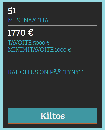 Joukkorahoitukseen liittyviin vastikkeisiin liittyvät kontaktoinnit rahoittajille tehdään elokuun [EDIT: lokakuun] aikana. Jos vastikkeesi on mallia ohjaus/valmennus niin voit ottaa meihin yhteyttä myös meihin päin.