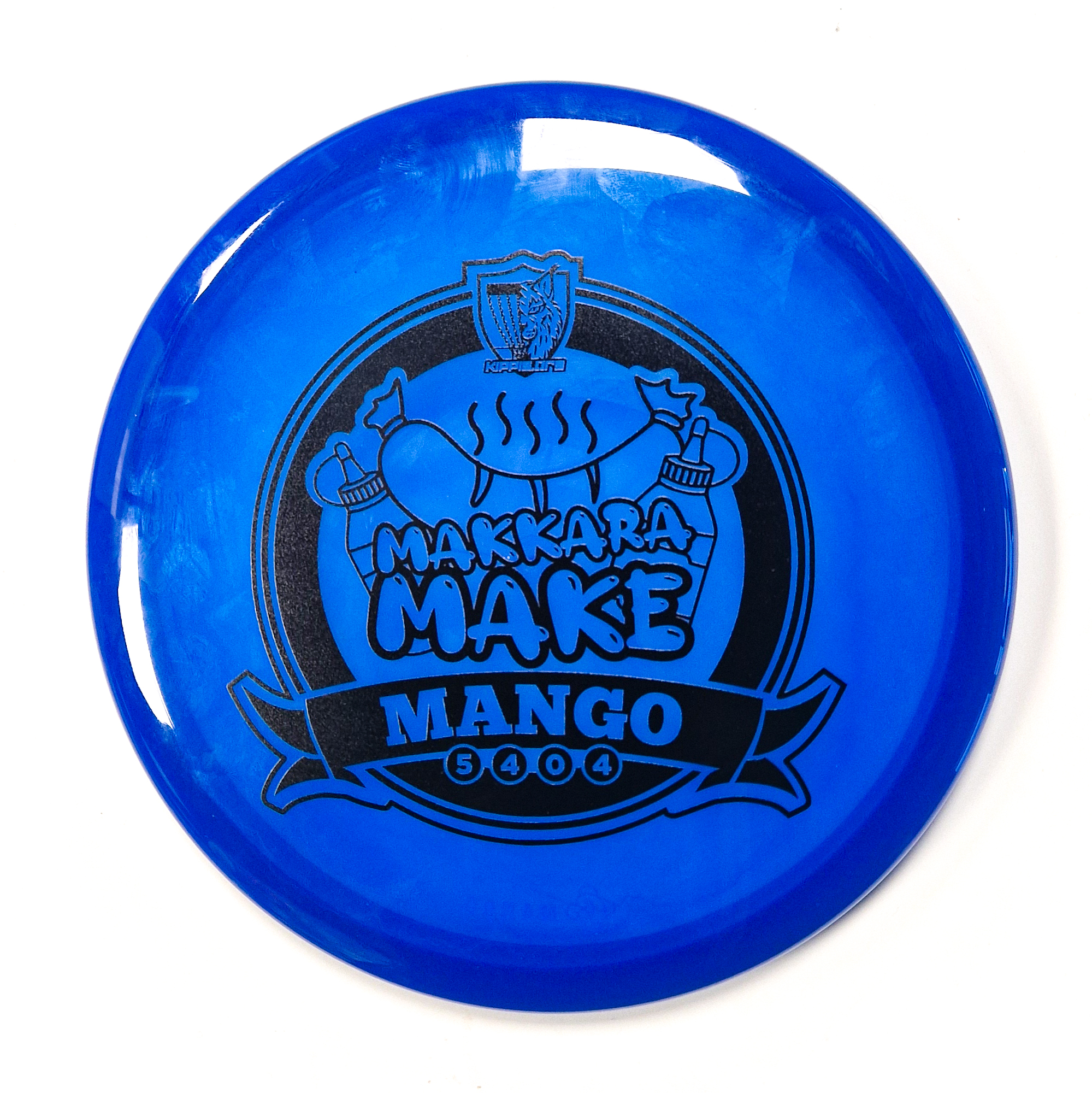 Makkara Maken oma signaturekiekko on Clash Discsin Mango, joka on oikein kiva keskimatkan kiekko. Tämä on sininen kiekko jossa on yksivärinen musta stämppi. Stämpin suunnitteli Mestari Känts Design <3